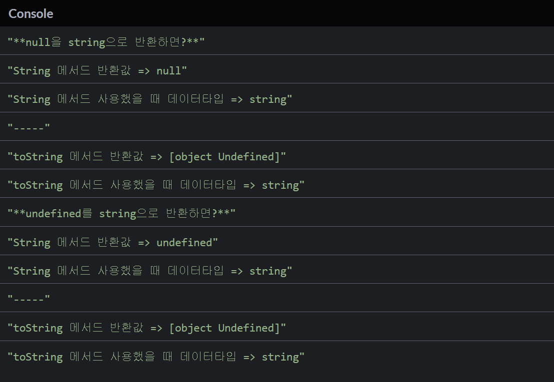 console.log(`String 메서드 반환값 => ${String(nullToString)}`);